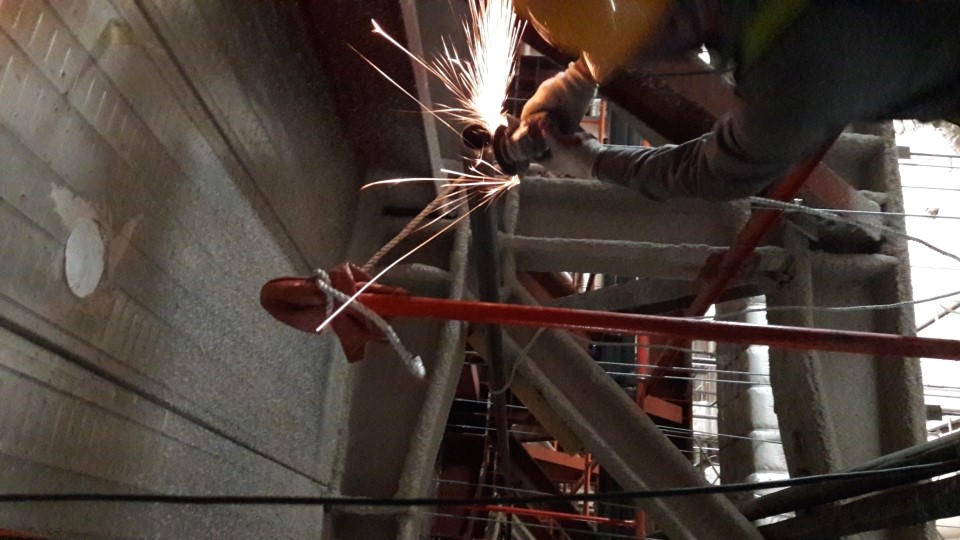↑ 용접하기 위해 그라인더로 작업하는 사진
